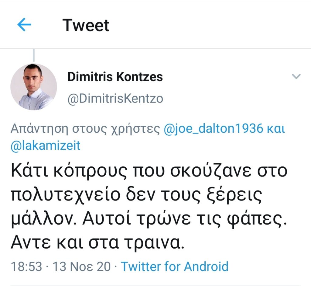 «Κάτι κόπρους που σκούζανε στο Πολυτεχνείο δεν τους ξέρεις μάλλον. Αυτοί τρώνε τις φάπες. Άντε και στα τρένα» σημείωνε χθες, στο twitter, ο Δ. Κοντζές, στέλεχος της ΟΝΝΕΔ, με αφορμή την εισβολή των αστυνομικών δυνάμεων στο Πολυτεχνείο και την σύλληψη δεκάδων ατόμων.