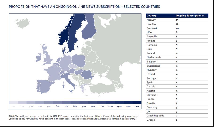 Ποσοστό ανά χώρα που πληρώνει για να έχει πρόσβαση σε ειδήσεις στο διαδίκτυο. Τελευταίοι οι Έλληνες και οι Τσέχοι με 2%.