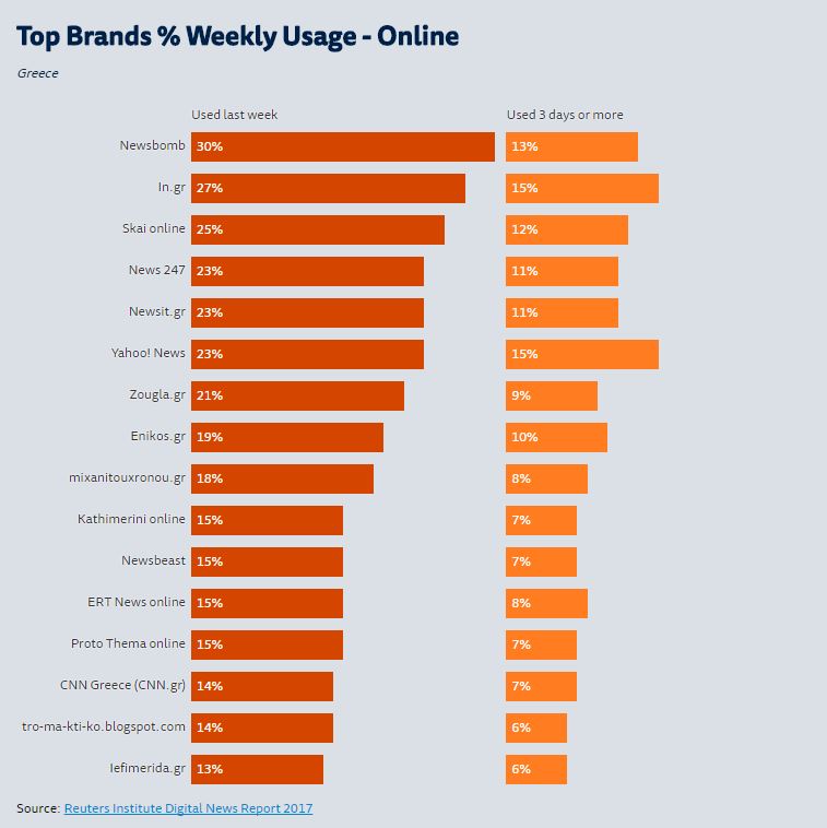 Η Ελλάδα, έτσι, βάσει του Ερευνητικού Ινστιτούτου του Reuters, είναι η μοναδική χώρα όπου οι πολίτες της εμπιστεύονται περισσότερο τα κοινωνικά δίκτυα (social media) από τα κυρίαρχα ΜΜΕ για να ενημερωθούν και να διασταυρώσουν τα νέα της ημέρας.