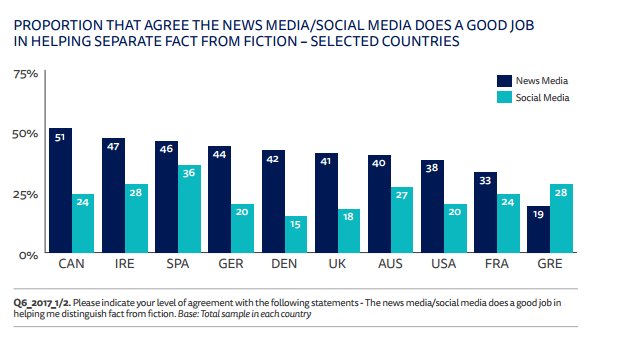 Ποσοστό πολιτών που πιστεύει ότι τα ΜΜΕ (μπλε σκούρο) και τα social media (ανοιχτό μπλε) κάνουν καλή δουλειά στο διαχωρισμό αληθινών και ψεύτικων ειδήσεων. Η Ελλάδα είναι η μοναδική χώρα όπου υπερτερεί η πίστη στα social media.
