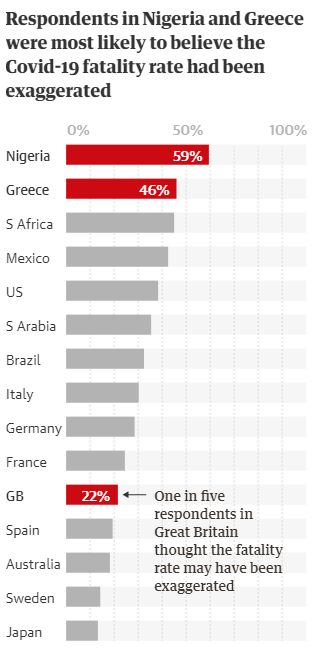 Μεταξύ άλλων χωρών, περίπου ένας στους τέσσερις Γάλλους και ένας στους πέντε Βρετανούς και Ισπανούς ερωτηθέντες πίστευαν ότι το παρουσιαζόμενο ποσοστό θανάτου εξαιτίας του κορονοϊού ήταν υπερβολικό, ενώ Αυστραλοί, Σουηδοί και Ιάπωνες εμφανίστηκαν με περισσότερες πιθανότητες να απορρίψουν μια τέτοια πεποίθηση.