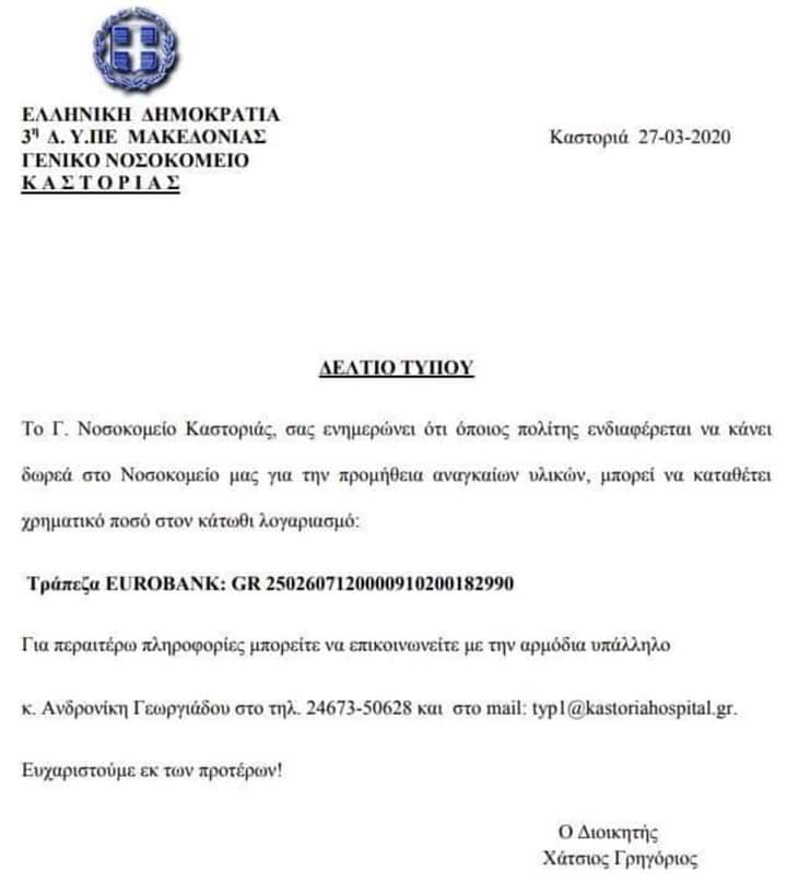 Ενδεικτικό της οριακής κατάστασης στην οποία βρίσκεται το νοσοκομείο, είναι η έκκληση που απευθύνει ο διευθυντής προς τους πολίτες για δωρεά προκειμένου να μπορέσει το νοσοκομείο να εφοδιαστεί με τα αναγκαία υλικά.