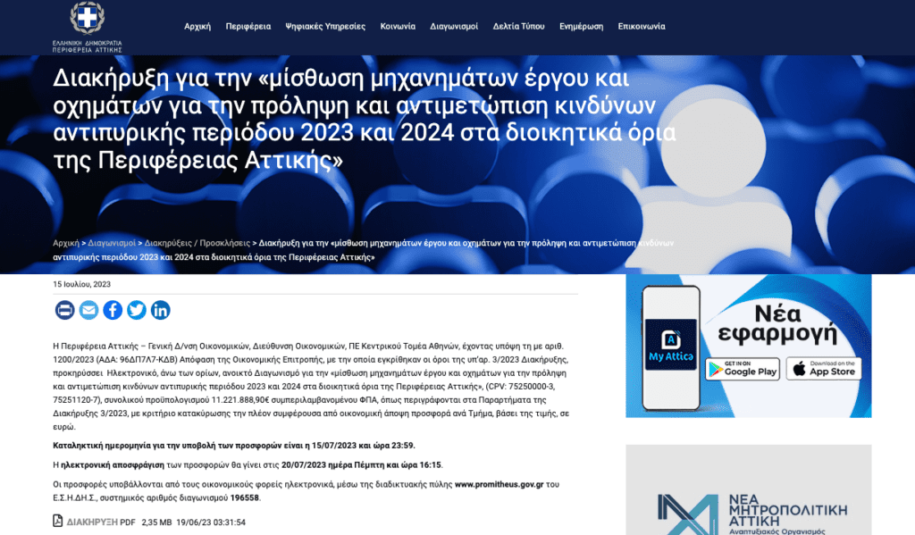 Όπως γράφει «ο διαγωνισμός της Περιφέρειας Αττικής με αντικείμενο τη “Μίσθωση μηχανημάτων έργου και οχημάτων για την πρόληψη και αντιμετώπιση κινδύνων αντιπυρικής περιόδου 2023 και 2024 στα διοικητικά όρια της Περιφέρειας Αττικής” δημοπρατήθηκε στην καρδιά της αντιπυρικής περιόδου, μόλις στις 15/7/23 και το άνοιγμα των προσφορών θα γίνει στις 20/7, χωρίς να μπορεί κανείς εκ των προτέρων με ασφάλεια να προβλέψει πότε και εάν θα υπογραφεί σύμβαση (αφού μπορεί να γίνουν προδικαστικές και δικαστικές προσφυγές κλπ)».