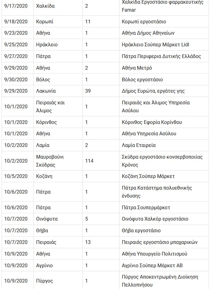 Ενδεικτικό των καταστάσεων που οδήγησαν στην απώλεια ελέγχου είναι η συνεχής αποκάλυψη εργασιακών χώρων κάθε είδους, αλλά ιδίως εργοστασίων με πολλαπλά κρούσματα κορονοϊού, από το καλοκαίρι ήδη μέχρι σήμερα.