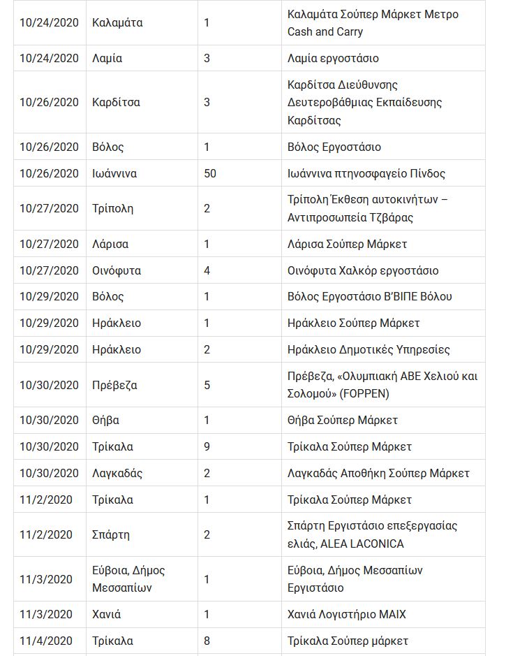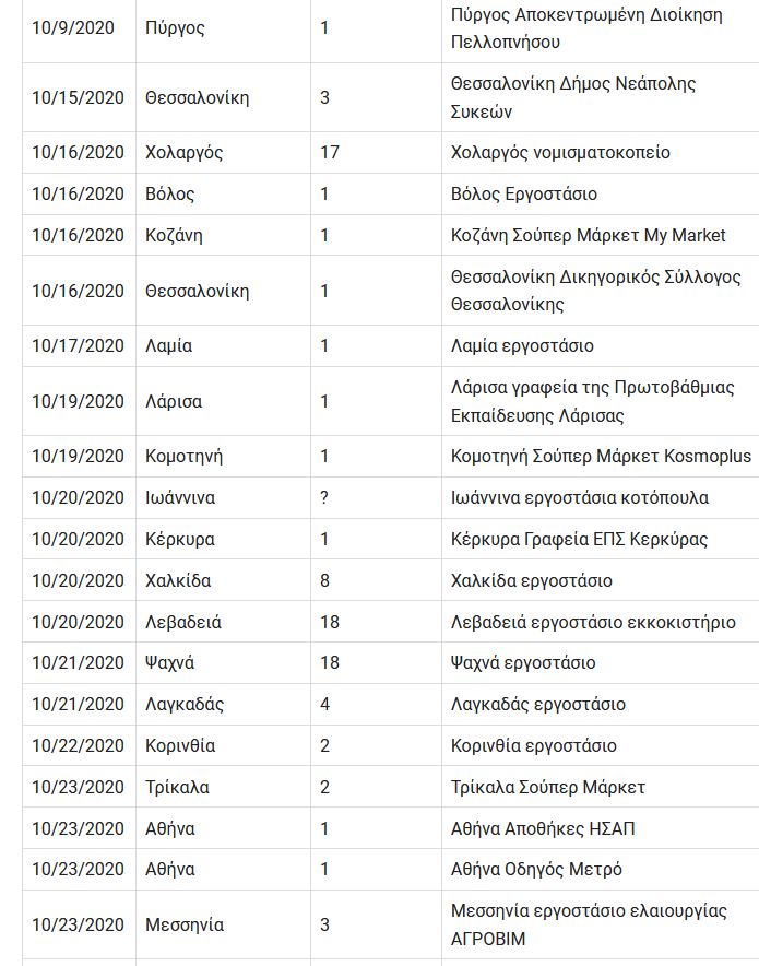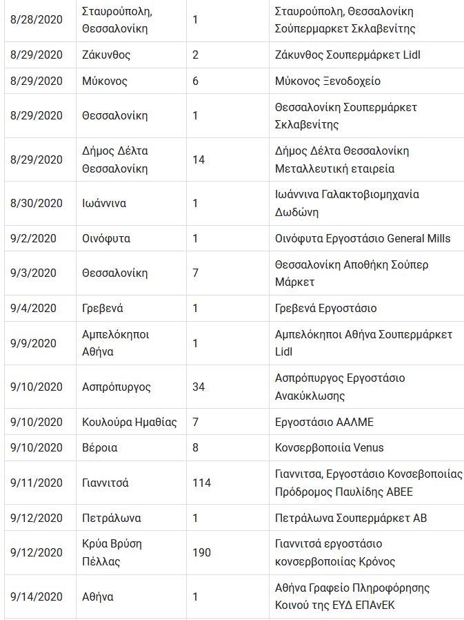 Κάτω, βλέπουμε ένα χάρτη των περιστατικών κρουσμάτων σε εργασιακούς χώρους που έχουν δημοσιευτεί και καταγραφεί, με παραπομπές στις διαδικτυακές πηγές. Οι αριθμοί είναι τα ανιχνευμένα κρούσματα την ημέρα του δημοσιεύματος. Περιλαμβάνονται εργοστάσια, αποθήκες, γραφεία, σούπερ μάρκετ, αλλά όχι νοσοκομεία, σχολεία, γηροκομεία…
