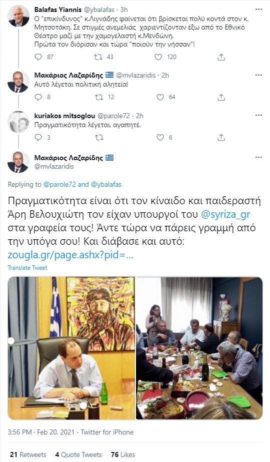 Στην ανάρτησή του, ο βουλευτής του ΣΥΡΙΖΑ έγραφε «Ο “επικίνδυνος” κ.Λιγνάδης φαίνεται ότι βρίσκεται πολύ κοντά στον κ. Μητσοτάκη. Σε στιγμές ανεμελιάς χαριεντίζονταν έξω από το Εθνικό Θέατρο μαζί με την χαμογελαστή κ.Μενδώνη. Πρώτα τον διόρισαν και τώρα “ποιούν την νήσσαν”!». Στην ανάρτηση, που δεν αναφερόταν στο πρόσωπό του, έσπευσε να απαντήσει αρχικά ο βουλευτής της Νέας Δημοκρατίας, Μακάριος Λαζαρίδης, απαντώντας πως «Αυτό λέγεται πολιτική αλητεία!». Στη συνέχεια, άλλος χρήστης του twitter του απάντησε πως «Πραγματικότητα λέγεται, αγαπητέ», με τον βουλευτή να σπεύδει να δώσει συνέχεια.