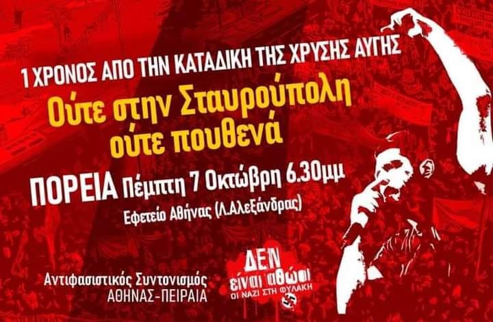 Θα το κάνουμε ξανά την Πέμπτη 7 Οκτώβρη σε μια πορεία που θα ξεκινήσει από το Εφετείο συμβολίζοντας την περυσινή ιστορική νίκη και θα καταλήξει στην Βουλή θέλοντας να δώσουμε ένα κεντρικό πολιτικό μήνυμα στην κυβέρνηση και την ακροδεξιά όλων των εκφάνσεων. Στηρίζουμε και συμμετέχουμε στην αντιφασιστική συναυλία που οργανώνουν οι φοιτητικοί σύλλογοι Αθήνας στην πλατεία Συντάγματος μετά το τέλος της πορείας.»
