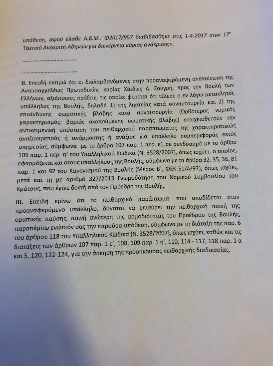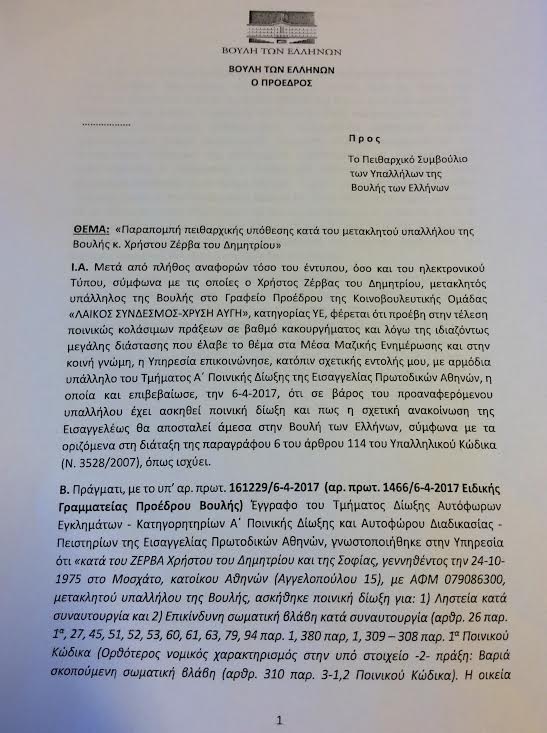 Ο πρόεδρο της Βουλής, στο παραπεμπτικό σημείωμα επικαλείται όχι μόνο τα δημοσιεύματα που φέρουν τον εν λόγω μετακλητό να έχει τελέσει «ποινικώς κολάσιμες πράξεις σε βαθμό κακουργήματος» – πρόκειται για την εμπλοκή του στο περιστατικό άγριου ξυλοδαρμού φοιτητή κοντά στην περιοχή των γραφείων της ΧΑ, αλλά και έγγραφο του Τμήματος Δίωξης Αυτόφορων Εγκλημάτων που στάλθηκε κατόπιν σχετικού αιτήματος στο γραφείο του. Πρόκειται για την άσκηση ποινικής δίωξης κατά του Χρ.Ζέρβα.