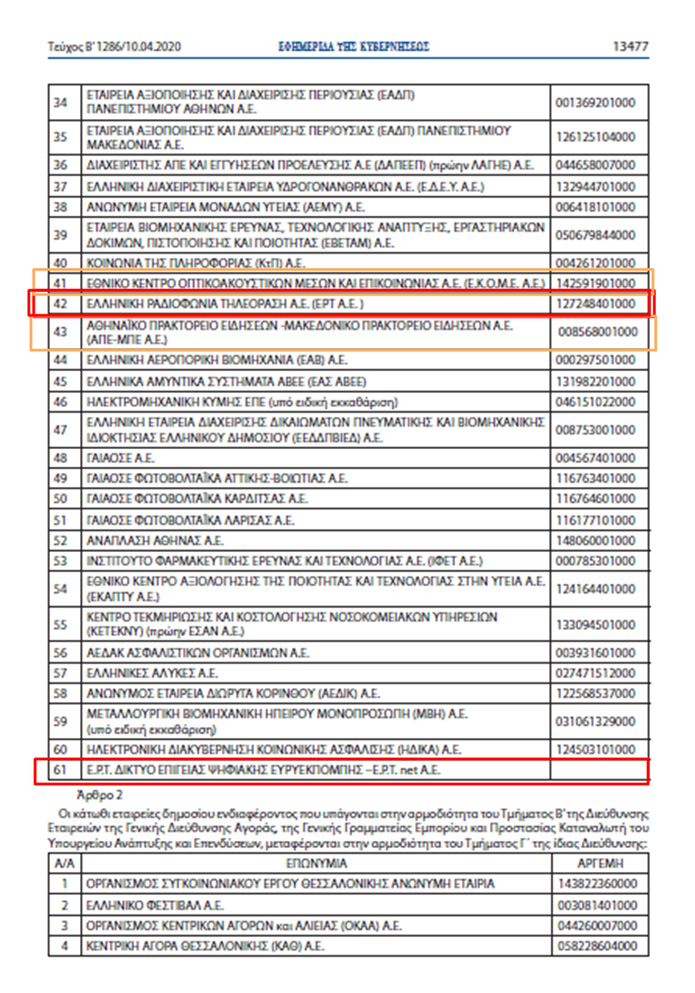 Σύμφωνα με το ΦΕΚ (Β’ 1286/10-04-2020), που ήρθε στη δημοσιότητα από την ΠΟΣΠΕΡΤ, με απόφαση του υφυπουργού Ανάπτυξης Ν. Παπαθανάση, μεταφέρονται οι εταιρείες του Δημοσίου, ΕΡΤ Α.Ε. ΕΡΤ net A.E. και το Αθηναϊκό Πρακτορείο Ειδήσεων στο τμήμα Γ’ της Διεύθυνσης Εταιρειών του Υπουργείου Ανάπτυξης και επενδύσεων, κατά την έννοια του Αρ.2 του Νόμου 4548/2018.