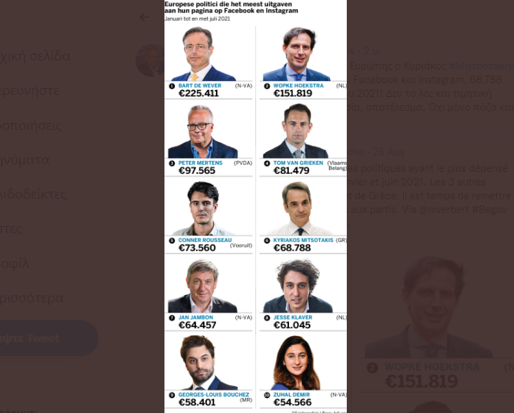 Στη λίστα, πολλές θέσεις κατέχουν οι Βέλγοι, καθώς υπάρχουν επτά Βέλγοι στους δέκα πολιτικούς που ξόδεψαν τα περισσότερα στο Facebook και το Instagram μεταξύ Ιανουαρίου και Ιουλίου 2021, όπως αναφέρει η φλαμανδική εφημερίδα De Standaard.