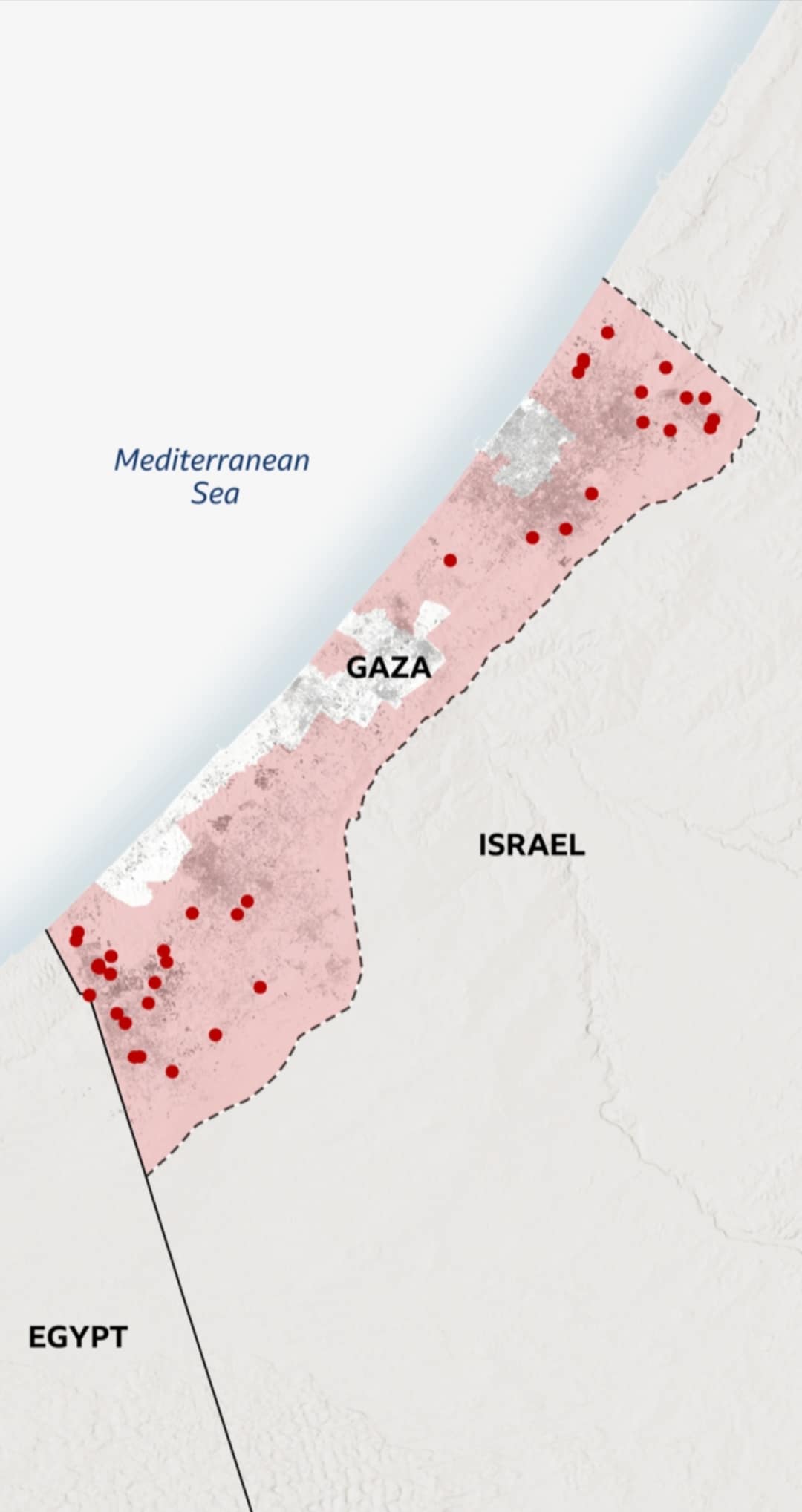 Δορυφορικές εικόνες που παρουσιάζει το BBC αποκαλύπτουν τεράστιες στοχευμένες και ελεγχόμενες καταστροφές σε αρκετές περιοχές, με τη στρατιωτική διοίκηση του Ισραήλ να ισχυρίζεται ότι εκείνες βρίσκονται υπό τον «επιχειρησιακό έλεγχο» του.