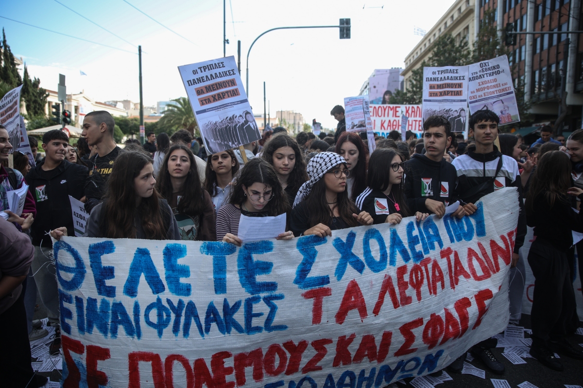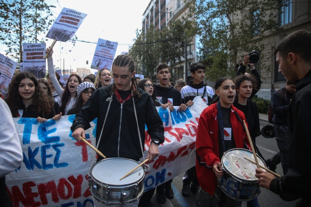 Από την πλευρά του, το Συντονιστικό Μαθητών της Αθήνας λέει «όχι» στο «Εθνικό Απολυτήριο», με το σύνθημα «τριπλές τις θέλετε τις Πανελλαδικές για να μας τα παίρνετε από όλες τις μεριές».