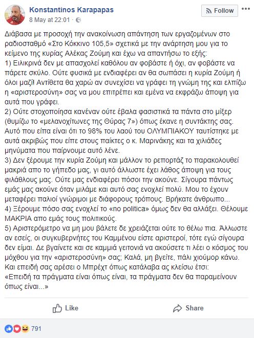 Μεταξύ άλλων, ο Κ. Καραπαπάς ανέφερε πως «ιλικρινά δεν με απασχολεί καθόλου αν φοβάστε ή όχι, αν φοβάστε να πάρετε σκύλο. Ούτε φυσικά με ενδιαφέρει αν θα σωπάσει η κυρία Ζούμη ή όλοι μαζί!» και πως «ξέρουμε πόσο σας ενοχλεί το “no politica” όμως δεν θα αλλάξει. Θέλουμε ΜΑΚΡΙΑ απο εμάς τους πολιτικούς».