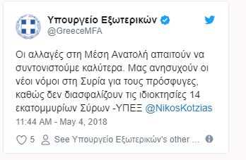Όσον αφορά τα γεγονότα στη Μέση Ανατολή, και ειδικότερα τη Συρία, ο υπουργός Εξωτερικών χαρακτήρισε, ότι διεξάγεται ένας «κατ΄επίφαση» εμφύλιος πόλεμος, καθώς συμμετέχουν σε αυτόν 9 δυνάμεις, ενώ, στη συνέχεια, εξέφρασε την ανησυχία του σχετικά με τη νομοθεσία της Συρίας η οποία δεν εξασφαλίζει τις περιουσίες των 14.000.000 προσφύγων που έχουν εγκαταλείψει τη χώρα, κάνοντας αμφίβολη την επιστροφή τους στη χώρα. Επιπλέον, σχολιάζοντας την παρουσία της Τουρκίας στο Αφρίν, ανέφερε ότι ένα τέτοιο γεγονός θέτει υπό αμφισβήτηση τη συνθήκη της Λωζάνης στα ανατολικά της σύνορα, κάτι που απασχολεί αρκετές χώρες, όπως την Ελλάδα.
