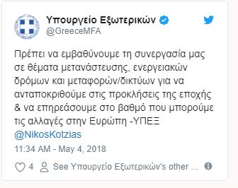 Αισιόδοξος εμφανίστηκε ο Ν. Κοτζιάς, σύμφωνα με ανάρτηση στο Twitter που έκανε το υπουργείο Εξωτερικών, μιλώντας για την ανέγερση «θετικής ατζέντας συνεργασίας».