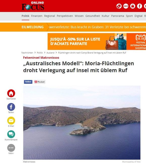 Το δημοσίευμα του Focus εχει τίτλο «Αυστραλιανό μοντέλο; Οι πρόσφυγες στη Μόρια απειλούνται με μεταγκατάσταση σε νησιά με κακή φήμη» και αναφέρεται στα επίσημα σχέδια της Νέας Δημοκρατίας για δημιουργία κέντρων κράτησης προσφύγων σε Μακρόνησο και Γυάρο.