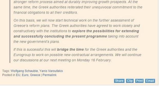 «Οι ελληνικές αρχές συμφώνησαν να εργαστούν στενά και εποικοδομητικά με τους θεσμούς για να διερευνήσουν τις δυνατότητες παράτασης και επιτυχούς ολοκλήρωσης του παρόντος προγράμματος λαμβάνοντας υπόψη τα σχέδια της νέας κυβέρνησης».