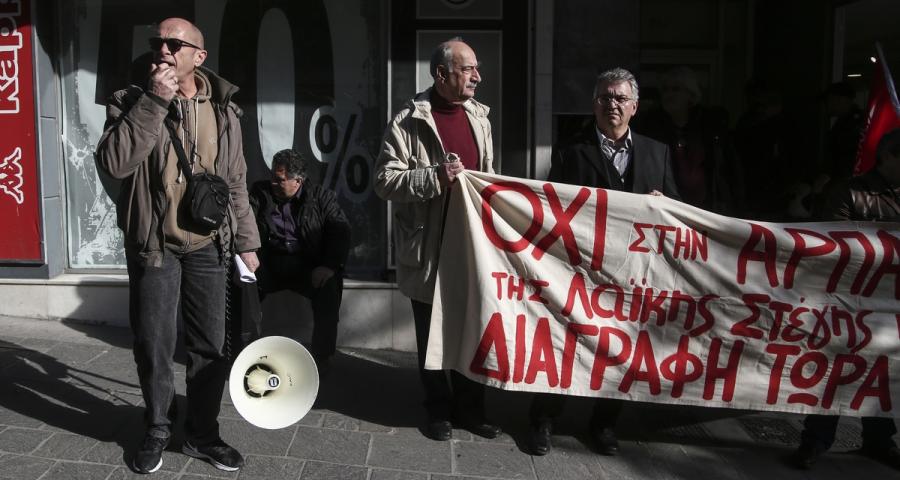 Το πρωί της Τρίτης συγκεντρώθηκαν πολίτες και μέλη συλλογικοτήτων, μεταξύ αυτών, της ΛΑΕ, αντιδρώντας στην πραγματοποίηση ηλεκτρονικών πλειστηριασμών. Παρόντες στη διαμαρτυρία ο επικεφαλής της ΛΑΕ, Παναγιώτης Λαφαζάνης και η επικεφαλής της Πλεύσης Ελευθερίας, Ζωή Κωνσταντοπούλου.