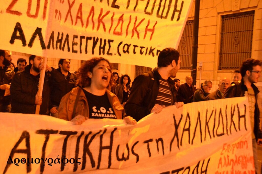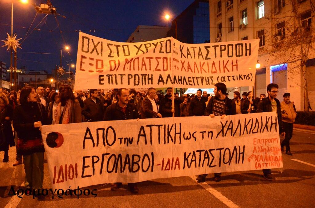 Τη συγκέντρωση και πορεία διοργάνωσε η«Επιτροπή Αλληλεγγύης στη Χαλκιδική», η οποία αναφέρει πως πραγματοποιείται «ενάντια στην κρατική τρομοκρατία που με κάθε τρόπο επιδιώκει την υλοποίηση των καταστροφικών για την τοπική κοινωνία σχεδίων του κεφαλαίου». Παράλληλα, επέκρινε την αστυνομία λέγοντας ότι «λειτουργώντας σαν μπράβος της εταιρείας αντιμετωπίζει τους διαδηλωτές με ασύλληπτη αγριότητα και βία η οποία σε πρώτη φάση χαρακτηρίστηκε από αλόγιστη χρήση χημικών μέσα στο δάσος, καταδιώξεις και τραυματισμούς διαδηλωτών».