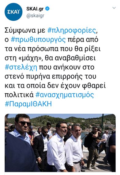 Πυρά κατά του τηλεοπτικού σταθμού ΣΚΑΪ εξαπέλυσε με ανακοίνωση του ο ΣΥΡΙΖΑ σχετικά με ανάρτηση είδησης του σταθμού από τον προσωπικό του λογαριασμό στο Twitter για το διάγγελμα του πρωθυπουργού από την Ιθάκη για τη λήξη του τρίτου μνημονίου. Η ανάρτηση είχε hashtag «παραμΙθάκη».