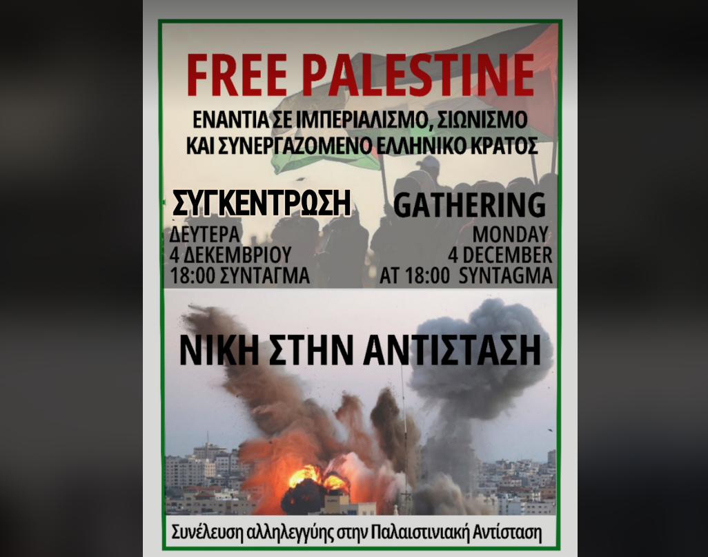 Υποστηρίζουμε το δικαίωμα των Παλαιστινίων στην αυτοάμυνα και στην αντίσταση! Η Ισραηλινή Κατοχή χρησιμοποιεί την ιμπεριαλιστική χειραγώγηση των μέσων ενημέρωσης. Για να συνεχίσουν με πλήρη ατιμωρησία τις σφαγές τους. Αγωνιζόμαστε ενάντια στη συνεργασία του ελληνικού κράτους με τον ιμπεριαλισμό και το κράτος-δολοφόνο του Ισραήλ.