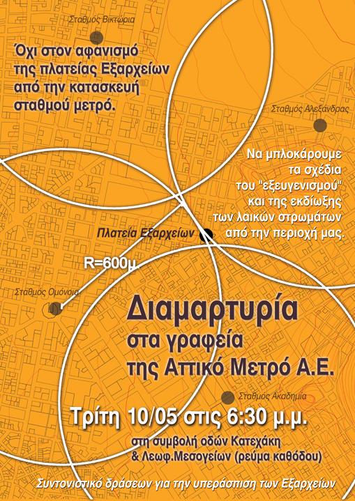Συγκέντρωση διαμαρτυρίας έξω από τα γραφεία της Αττικό Μετρό Α.Ε. θα πραγματοποιήσει το συντονιστικό δράσεων για την υπεράσπιση των Εξαρχείων, την ερχόμενη Τρίτη, στις 6:30 μ.μ.