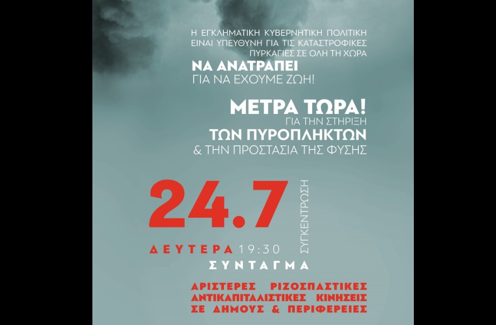 Καλούμε σε συγκέντρωση αλληλεγγύης στους πληγέντες και αγώνα ενάντια στην πολιτική που πυρπολεί το περιβάλλον και τις ζωές μας τη Δευτέρα 24 Ιουλίου στις 19.30 στο Σύνταγμα.