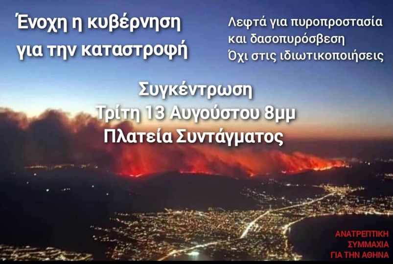 Τις εταιρείες ενέργειας που ενώ εκτινάσσουν τα κέρδη τους αφήνουν δίκτυα και γραμμές ασυντήρητα με αποτέλεσμα δεκάδες φωτιές να ξεκινάνε από καλώδια, μετασχηματιστές, σταθμούς της ΔΕΗ – που λειτουργούν χάρη στην αυτοθυσία των εναεριτών. Και τέλος στο όνομα της «ασφάλειας», αντί να προστατεύει από τις φωτιές, να ενισχύει τους μηχανισμούς καταστολής για να κυνηγάνε διαδηλωτές, να ενισχύει το λιμενικό για να κυνηγάει πρόσφυγες και να σπαταλά πολλά δις ευρώ κάθε χρόνο σε εξοπλισμούς. Σε τι μεταφράζεται αυτό; Μεταφράζεται σε περισσότερα περιπολικά και λιγότερα πυροσβεστικά οχήματα, περισσότερα F16 και λιγότερα εναέρια μέσα πυρόσβεσης.