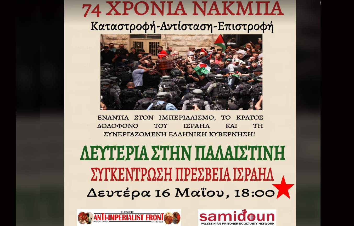 «74 Χρόνια οι επιθέσεις, οι βομβαρδισμοί, οι σφαγές εναντίον του ηρωικού Παλαιστινιακού λαού συνεχίζονται. Τα πρόσφατα γεγονότα των συνεχόμενων επιθέσεων στο Αλ Ακσα, οι συλλήψεις εκατοντάδων Παλαιστινίων, οι επεμβάσεις του ισραηλινού στρατού στην Κατεχόμενη Δυτική Όχθη, η δολοφονία της δημοσιογράφου Shireen Abu Aqleh με πυροβολισμό στο κεφάλι και η βεβήλωση της κηδείας της με εκ νέου επίθεση, από τους φονιάδες του Ισραηλινού στρατού, αναδεικνύουν ξεκάθαρα ποιος είναι αυτός που τρομοκρατεί τους λαούς της περιοχής» αναφέρει η ανακοίνωση.