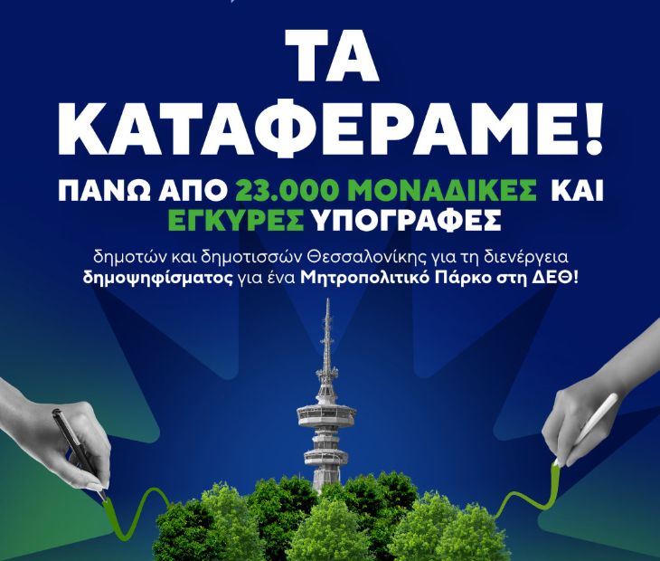 Με μεγάλη χαρά και υπερηφάνεια, η Οργανωτική Επιτροπή Δημοψηφίσματος ανακοινώνει ότι, μετά και τους τελευταίους ελέγχους, το αίτημα για τη διενέργεια δημοψηφίσματος έχει ήδη συγκεντρώσει πάνω από 23.000 μοναδικές και έγκυρες υπογραφές δημοτών και δημοτισσών Θεσσαλονίκης.