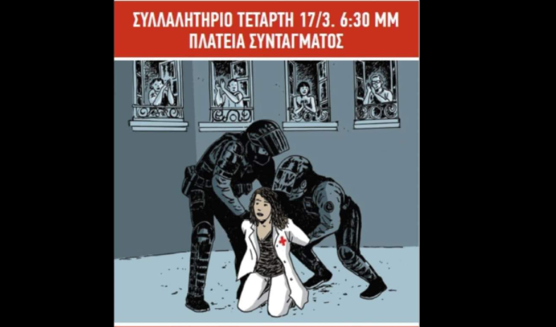 Καλούμε σε πλατιά μαζική λαϊκή κινητοποίηση την Τετάρτη 17/3/2021 στο Σύνταγμα στις 18:30, με σκοπό να πορευτούμε και να συναντήσουμε τους αγωνιζόμενους γιατρούς της ΟΕΝΓΕ για την υπεράσπιση της δημόσιας υγείας, τα συνδικάτα, τα σωματεία και τις ομοσπονδίες και κλάδους που κινητοποιούνται και αυτοί ενάντια στην κυβερνητική διαχείριση της πανδημίας, με αίτημα τη γενναία ενίσχυση του ΕΣΥ και την προστασία της υγείας του λαού, ενάντια στην καταστολή και την εργοδοτική τρομοκρατία, ενάντια στον αυταρχισμό και την κλιμακούμενη αστυνομική βία.