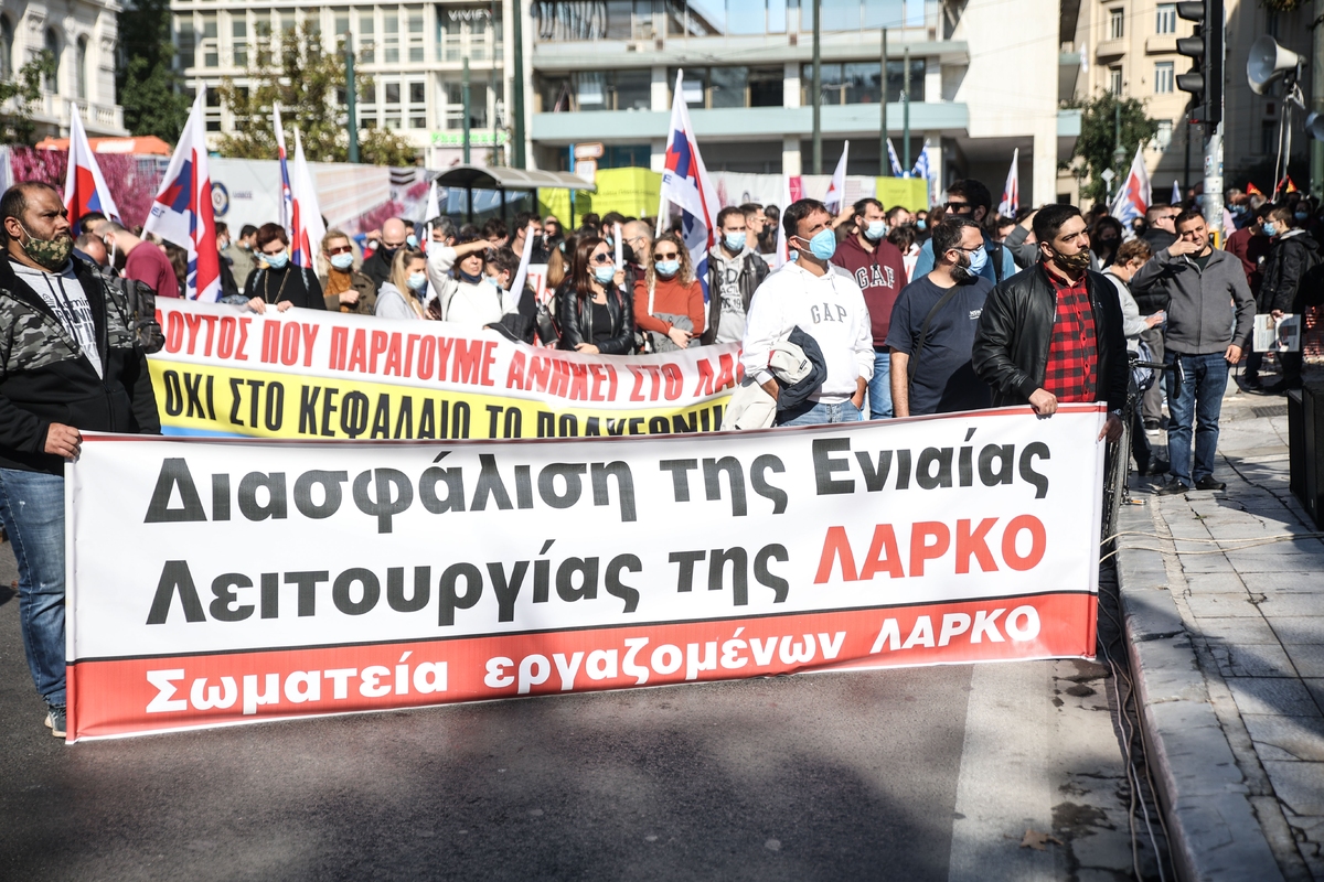 Μεγάλη συγκέντρωση και απεργία πραγματοποιήθηκε σήμερα, Σάββατο, το μεσημέρι στο Σύνταγμα, στο κέντρο της Αθήνας, έξω από το υπουργείο Οικονομικών από τους εργαζομένους στη ΛΑΡΚΟ καθώς η εταιρεία προκείται να ξεπουληθεί από την κυβέρνηση Μητσοτάκη. Οι εργαζόμενοι συγκεντρώθηκαν αρχικά στη Σταδίου και με πορεία κατέληξαν έξω από το υπουργείο Οικονομικών. Μια αντιπροσωπεία επισκέφθηκε το Μαξίμου για να επιδώσει το ψήφισμα της συγκέντρωσης με τα αιτήματα των εργατών της ΛΑΡΚΟ και ορίστηκε συνάντηση με τον υπουργό Επικρατείας Γιώργο Γεραπετρίτη εντός της επόμενης εβδομάδας.