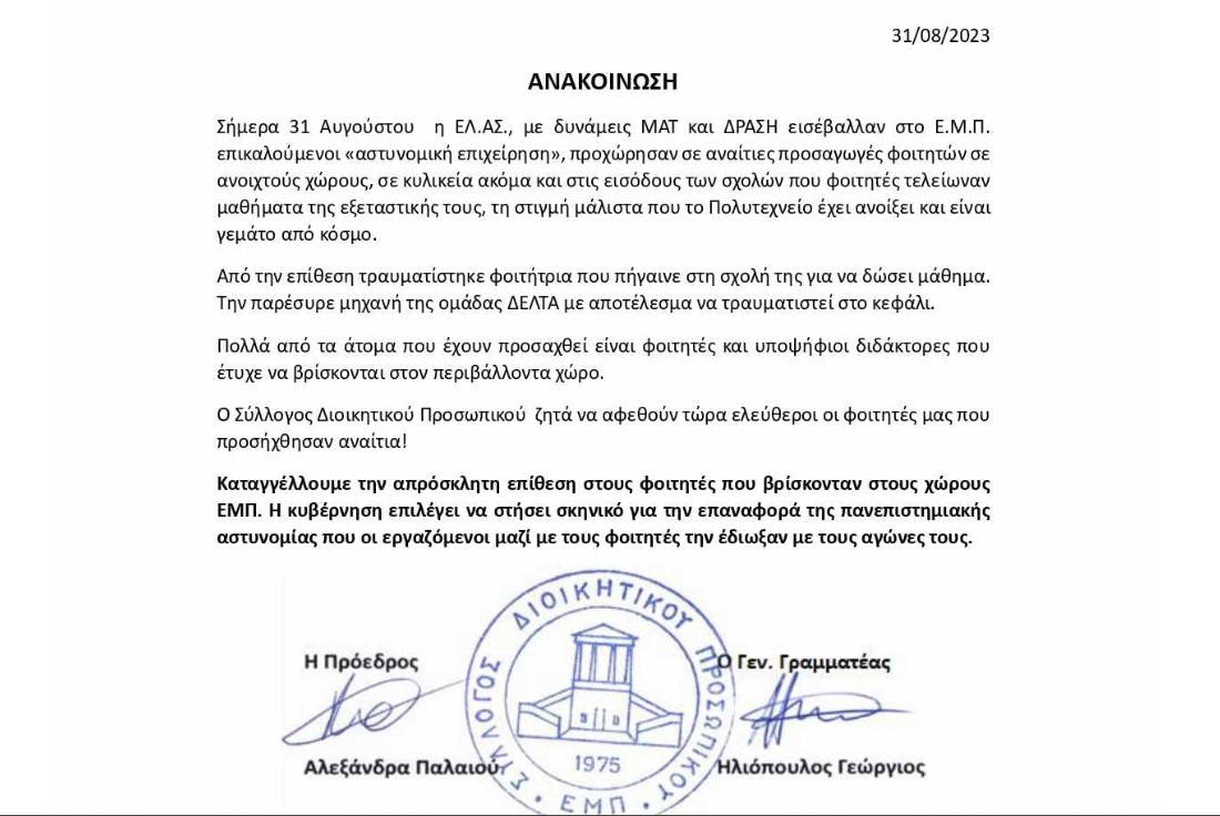 Ολόκληρη η ανακοίνωση του Συλλόγου του Διοικητικού Προσωπικού του ΕΜΠ: