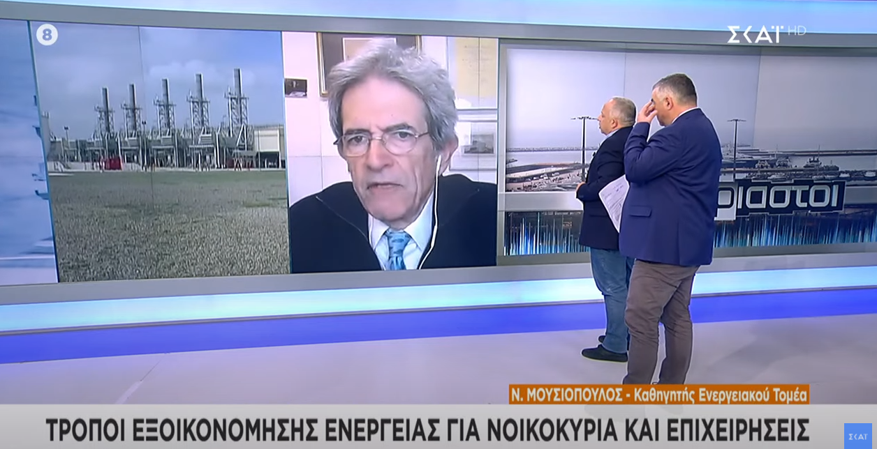 Καλεσμένος στον ΣΚΑΙ ο καθηγητής ενεργειακού τομέα, Νικόλαος Μουσιόπουλος, κλήθηκε από τους σχολιαστές να δώσει πρακτικές λύσεις μείωσης ενέργειας. «Με θερμομόνωση μπορεί να μειώσει κανείς κατά 70% την ανάγκη για θέρμανση χώρων» είπε ο καθηγητής, τονίζοντας πως «πολύ λίγα μπορούμε να κάνουμε τώρα και δε θα λυθεί το πρόβλημα αύριο ή μεθαύριο».