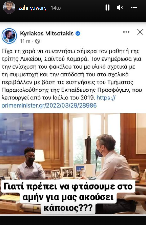 Ο Ζαχίρ Γιαβαρί πρόσφυγας από το Αφγανιστάν, που έγινε γνωστός από τη συμμετοχή του στο Master Chef, σχολίασε την πρόσφατη συνάντηση του Πρωθυπουργού με τον Σαϊντού Καμαρά.