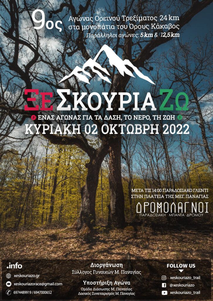 Την Κυριακή 2 Οκτώβρη διεξάγεται ο 9ος Αγώνας Ορεινού Τρεξίματος 24km «ΞεΣκουριάΖω» στο όρος Κάκαβος. Φέτος θα υπάρχει κι ένας επιπλέον αγώνας ορεινού τρεξίματος 12,5km ενώ την ίδια ημέρα πραγματοποιείται και ο καθιερωμένος Λαϊκός Αγώνας Δρόμου 5km γύρω από το χωριό Μεγάλη Παναγία. Το μεσημέρι, αμέσως μετά τις απονομές των αγώνων, θα πραγματοποιηθεί παραδοσιακό γλέντι στην πλατεία του χωριού με την παραδοσιακή μπάντα «Δρομολάγνοι».