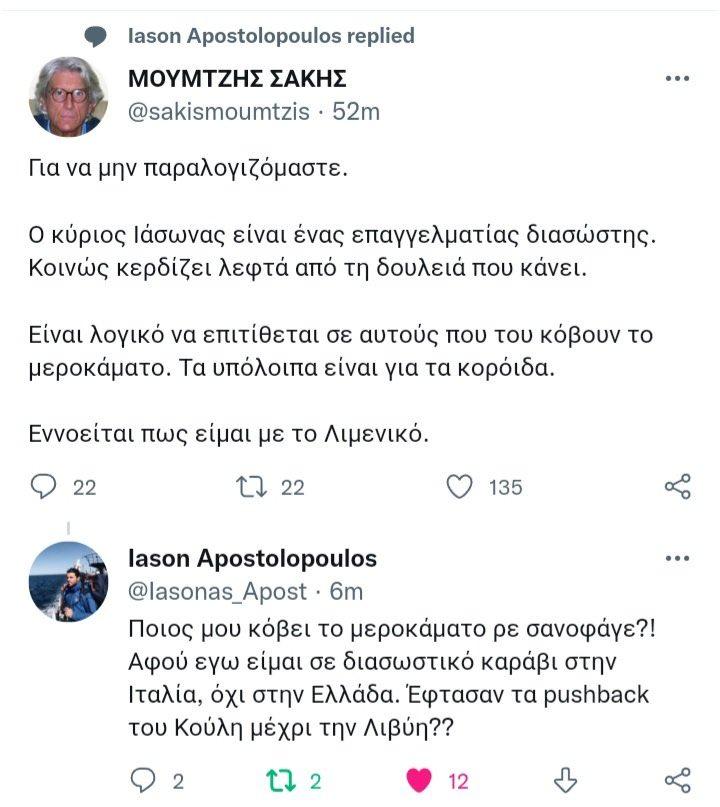 Ο σχολιαστής της Καθημερινής Σάκης Μουμτζής και γνωστο στέλεχος της ΝΔ Νίκος Σωτηρόπουλος συνέχισαν τη στοχοποίηση, αναφερόμενοι στην διάσωση ανθρώπων στη θάλασσα σαν μια χρυσή «μπίζνα». Μάλιστα, κάτω από την ανάρτηση του τελευταίου, ανώνυμα τρολς έφτασαν στο σημείο να εξαπολύουν απειλές θανάτου κατά του διασώστη. Το ίδιο τρολ σχολίασε «καθαρίστε τον» και σε ανάρτηση του δημοσιογράφου, Μπάμπη Παπαπαναγιώτου, ο οποίος κατηγόρησε τον Ιάσονα Αποστολόπουλο για «στυγνή ανθελληνική προπαγάνδα».
