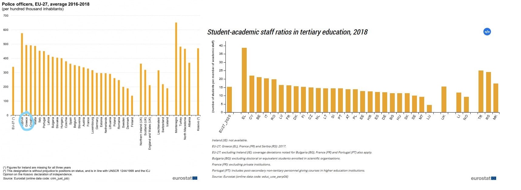 Επισυνάπτοντας και τους σχετικούς πίνακες, ο εκπρόσωπος Τύπου του κόμματος της αξιωματικής αντιπολίτευσης υπογραμμίζει πως «η Ελλάδα είναι δεύτερη στην Ε.Ε. σε αναλογία αστυνομικών ανά 100 χιλ. κατοίκους», ενώ παράλληλα, «η Ελλάδα είναι τελευταία στην Ε.Ε. στην αναλογία ακαδημαϊκοί / φοιτητές. Ο Ευρωπαϊκός μ.ο. είναι ότι σε κάθε ακαδημαϊκό αντιστοιχούν 15,3 φοιτητές, ενώ στην Ελλάδα αντιστοιχούν 38,7».