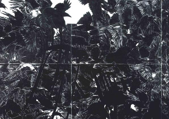 Το σμήνος των αφρόνων επιτιθεμένων πουλιών που παραπέμπει στο ετερόκλητο πλήθος των μητροπόλεων είχε ήδη απασχολήσει τη Λάσκαρη το 2010 στο ομώνυμο animation Swarm. Το σμήνος που τότε παρουσιαζόταν οργανωμένο και απειλητικό, έτοιμο να επιτεθεί, τώρα στο νέο μεγάλο ασπρόμαυρο σχέδιο μοιάζει ανεξέλεγκτο και αυτοκαταστροφικό. Το χαρακτηρίζει η εσωτερική σύγκρουση και αγωνία. Στο Suspended Forces, το σμήνος φαίνεται πια να έχει περάσει στον ιδιωτικό μας χώρο και να έχει διαρρήξει τα όρια ιδιωτικού και δημόσιου, ατομικού και συλλογικού, του 'μέσα' και του 'έξω'. Οτιδήποτε οικείο πλέον παραγκωνίζεται και κάτι βίαιο συνεχώς υπονοείται. Τα αντικείμενα που κυριαρχούν στο χώρο αν και γνώριμα είναι παραμορφωμένα, αναποδογυρισμένα ή παραπεταμένα. Το χρώμα απουσιάζει. Σχέδια, αντικείμενα και φωτογραφίες εκφράζουν τη συνεχή σύγκρουση αλλά και αλληλεξάρτηση αντίθετων δυνάμεων που μοιάζουν να μένουν μετέωρες.