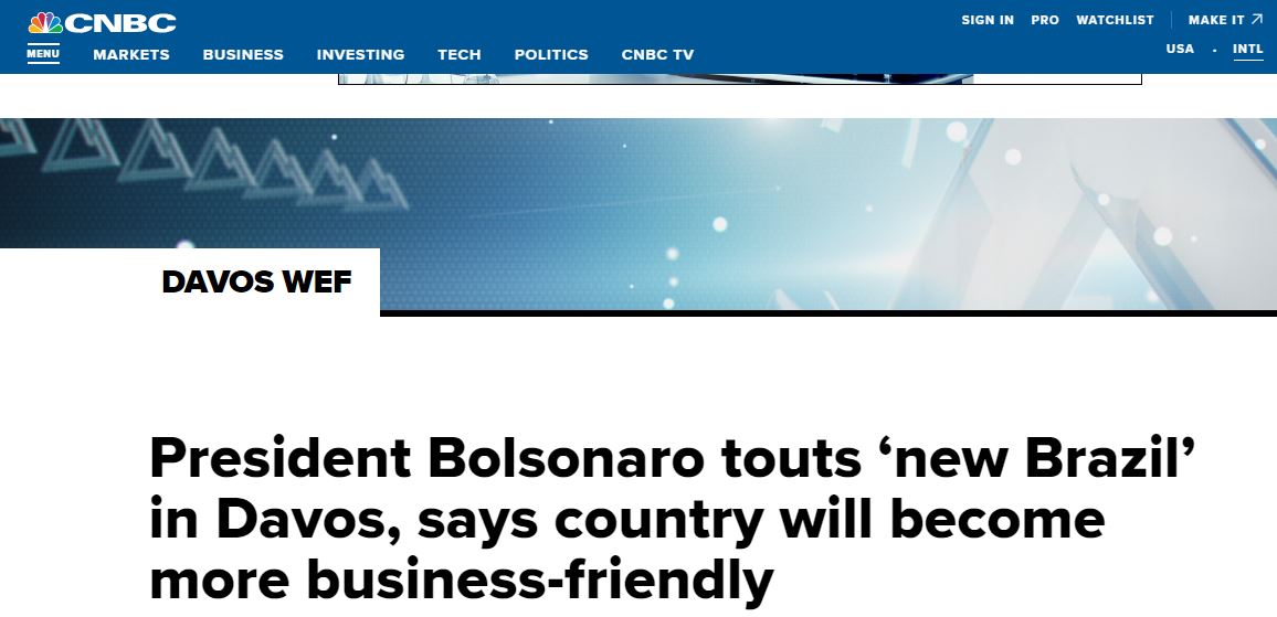 Ο πρόεδρος Μπολσονάρου παρουσιάζει τη Νέα Βραζιλία στο Νταβός και υποστηρίζει ότι η χώρα του θα γίνει πιο φιλική προς τις επενδύσεις (CNBC)