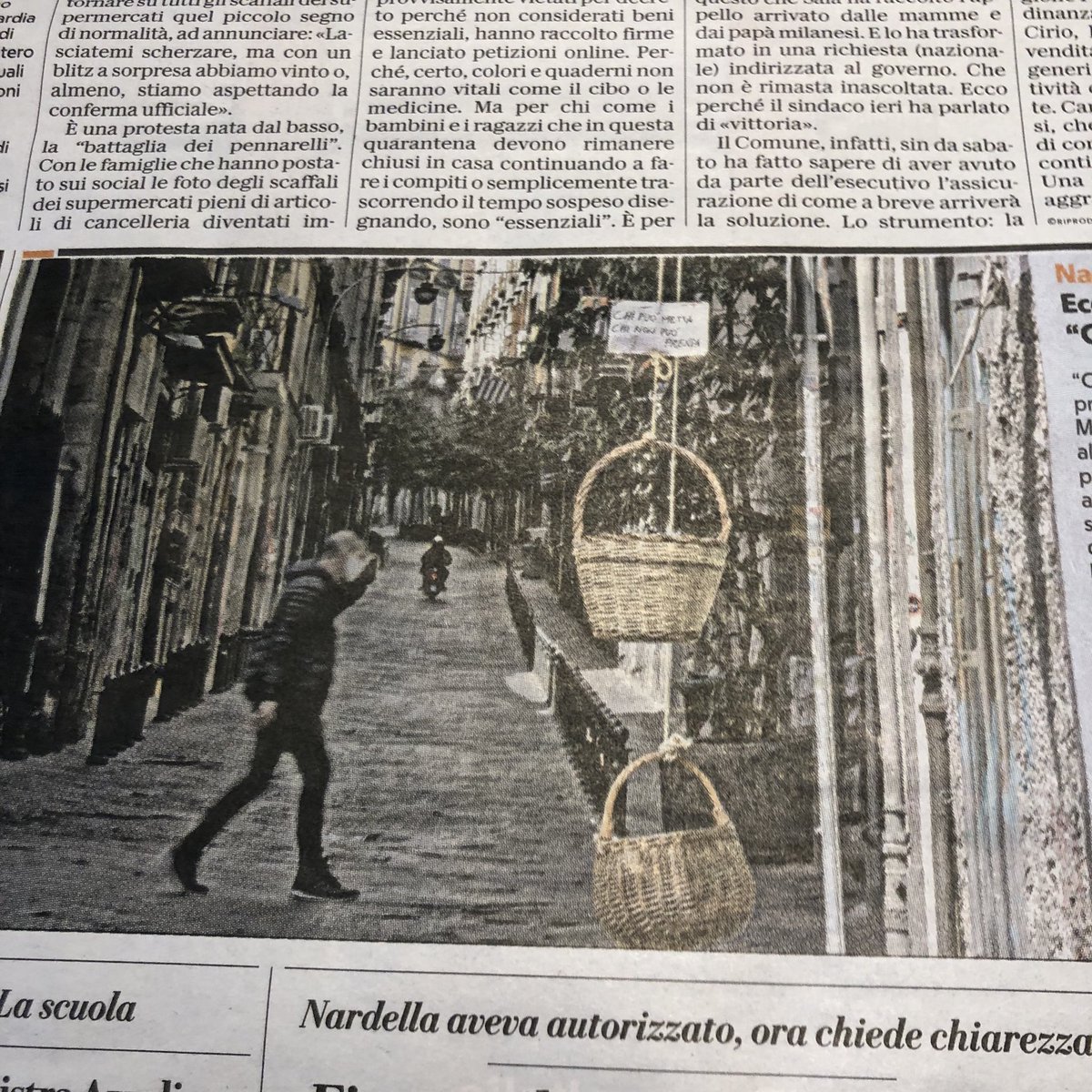 Αυτή τη φορά τα δύο καλάθια που κατέβηκαν από ένα ναπολιτάνικο μπαλκόνι, πάλι σε περίοδο επιδημίας, έχουν στόχο την αλληλεγγύη. Την ίδια ώρα που άνθρωποι στη Νότια Ιταλία βρίσκονται στο κατωφλι της πείνας, τα καλάθια της αλληλεγγύης γεμίζουν και αδειάζουν από τρόφιμα στα οποία κάποιοι βασίζονται για την επιβίωσή τους.