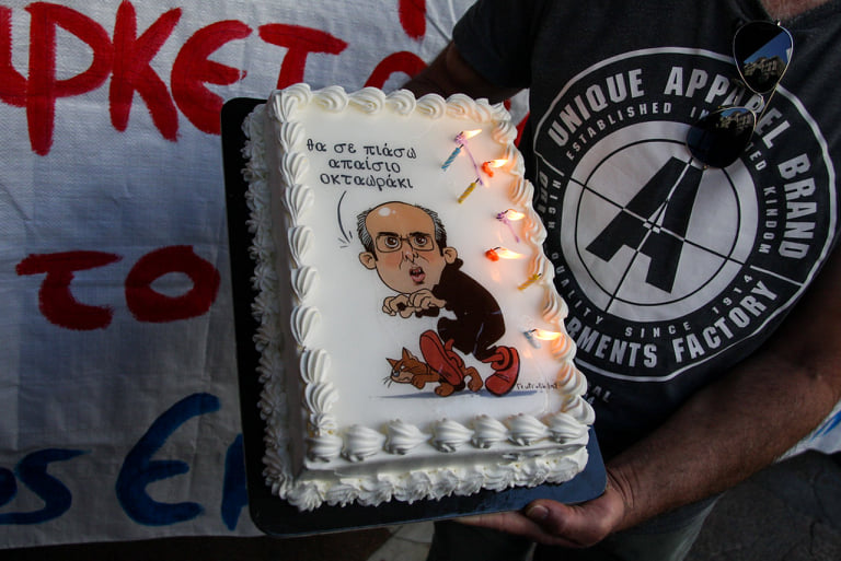 Μάλιστα, οι εργαζόμενοι που βρέθηκαν έξω από το υπουργείο μετά από σχετικό κάλεσμα του Συλλόγου Εμποροϋπαλλήλων Αθήνας επιφύλαξαν έκπληξη στον Κ. Χατζηδάκη με τούρτα και ένα διαφορετικό τραγούδι γενεθλίων.