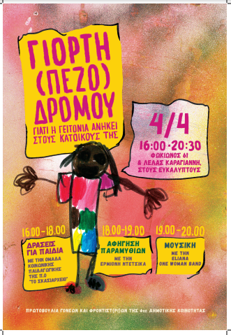 Απέναντι σε αυτές τις εξελίξεις, οι γονείς δεν μένουν αδρανείς. Το Σάββατο 4 Απριλίου στις 16.00 διοργανώνουν τη «Γιορτή (Πεζο)δρόμου», μια ανοιχτή δράση στη συμβολή των οδών Φωκίωνος Νέγρη και Λέλας Καραγιάννη στον χώρο με τους ευκάλυπτους, με στόχο όχι μόνο τη διαμαρτυρία αλλά και τη δημιουργική διεκδίκηση του δημόσιου χώρου.