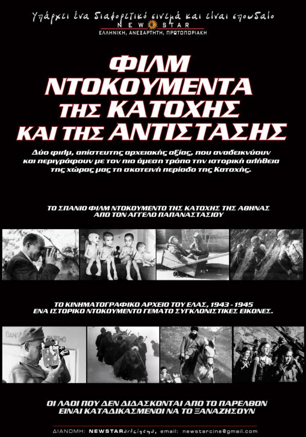 H NEWSTAR και ο κινηματογράφος «ΑΛΕΞΑΝΔΡΑ newstar art cinema» (Κρέμου 141, Καλλιθέα, τηλ.: 210.512624), προβάλλουν μέχρι την ερχόμενη Τετάρτη, με δωρεάν είσοδο και με ειδικές πρωινές προβολές ανήμερα την 17η Νοεμβρίου, δύο σπάνια ντοκουμέντα για την Κατοχή και την Αντίσταση στην Ελλάδα.