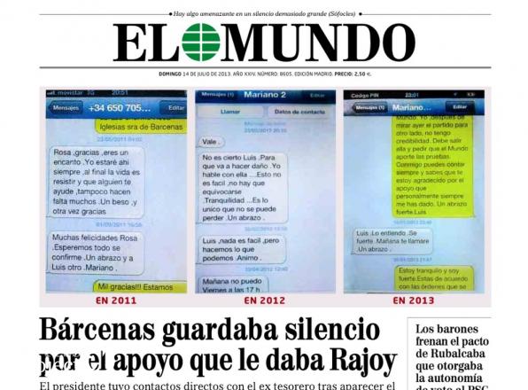 Η εφημερίδα δημοσιεύει γραπτά μηνύματα που φέρεται πως αντάλλαξε ο πρωθυπουργός Ραχόι με τον  πρώην ταμεία του ΡΡ, Λουίς Μπαρθένας, προφυλακισμένο από τον Ιούνιο για ξέπλυμα χρήματος και φορολογικές απάτες.