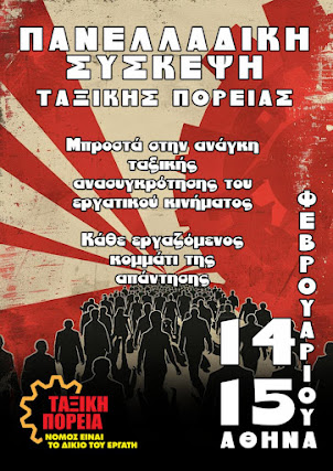 Για να μπορέσουμε, λοιπόν, να οργανώσουμε καλύτερα τον αγώνα μας, να συζητήσουμε για την ταξική, εργατική κατεύθυνση της διεκδίκησης και της αντίστασης στο κεφάλαιο και την εργοδοσία, η ΤΑΞΙΚΗ ΠΟΡΕΙΑ κάνει ανοιχτό κάλεσμα σε όλους τους εργαζόμενους, όλους τους ταξικούς αγωνιστές που αντιλαμβάνονται τον εαυτό τους σαν κομμάτι της λύσης απέναντι στο πρόβλημα που λέγεται «καπιταλιστική κυριαρχία και εκμετάλλευση», να συμμετάσχουν στην Πανελλαδική Σύσκεψη που διοργανώνει το Σαββατοκύριακο 14-15 Φεβρουαρίου στην Αθήνα.