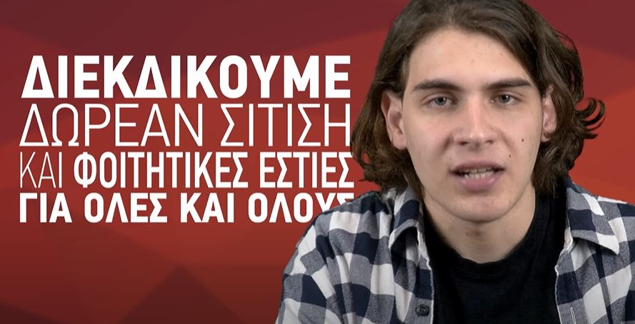 Όπως τονίζει, την ώρα που το σούπερ μάρκετ είναι απλησίαστο, οι φοιτητές αναγκάζονται να δίνουν 110 ευρω μηνιαίως για τη «δωρεάν» σίτιση. «Διεκδικούμε δωρεάν σίτιση και φοιτητικές εστίες για όλους. Δε θα ανεχτούμε να αντιμετωπίζουν τις ανάγκες μας ως Buisiness Plan», τονίζει.
