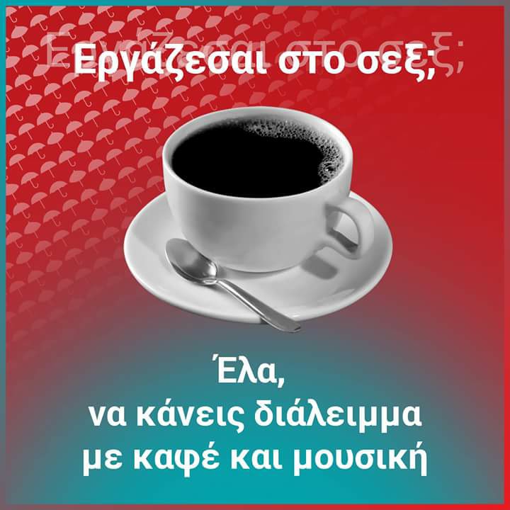 “Do you work in sex? Come, take a break, have some coffee and music”. From the group Red Umbrella Athens.