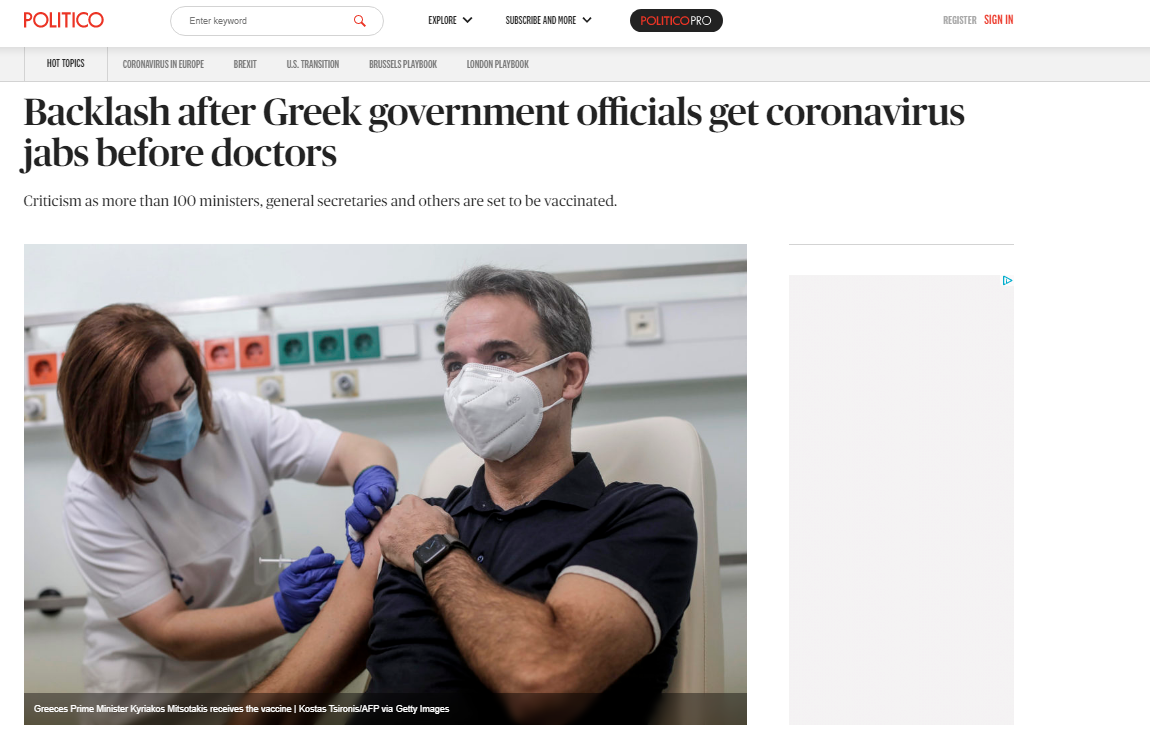 Θέμα στο Politico οι εμβολιασμοί δεκάδων αξιωματούχων της ελληνικής κυβέρνησης πριν από τους γιατρούς