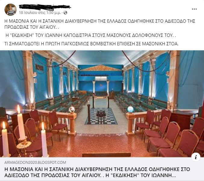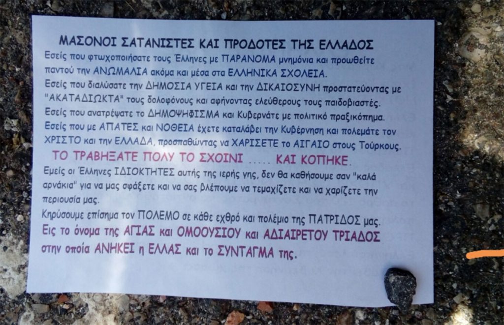 Μάλιστα, λίγες μέρες μετά την επίθεση στην Τεκτονική Στοά δημοσίευσε ένα άρθρο στην προσωπική του ιστοσελίδα, στο οποίο σχολίαζε την έκρηξη στην οδό Αχαρνών κάνοντας λόγο για τιμωρία από τον «Πολέμαρχο του Θεού» ο οποίος θα πολεμήσει «δια όπλων» τις σατανικές δυνάμεις, καθώς και φωτογραφίες από φέιγ βολάν τα οποία παρουσίαζε ως προκήρυξη για την επίθεση στο κτίριο της Τεκτονικής Στοάς. Τα φέιγ βολάν με τίτλο «Μασόνοι Σατανιστές και Προδότες της Ελλάδος», ανέγραφαν μεταξύ άλλων «κηρύσσουμε επίσημα τον πόλεμο σε κάθε εχθρό και πολέμιο της πατρίδος μας».